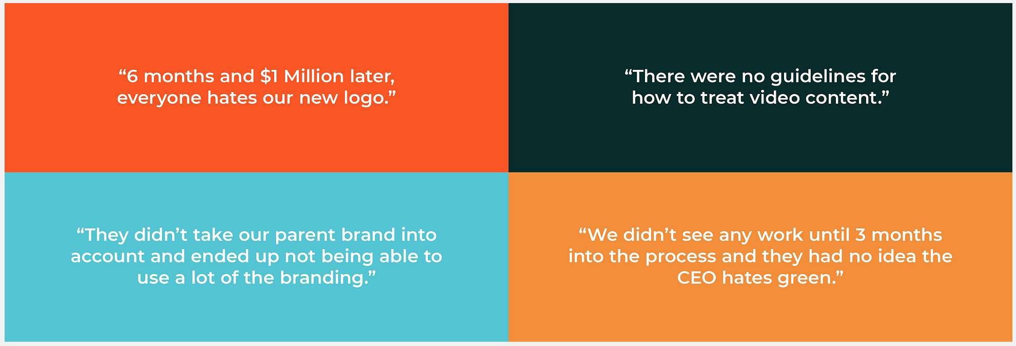 Typical brand evolution projects with a traditional agency take too much time and yield results that aren't actionable in the real world. With RBP, we move quickly from hypothetical to real content, pressure-testing and refining a workable set of guidelines that sets you up for a deeper dive in any specific content areas or a more extensive branding evolution.